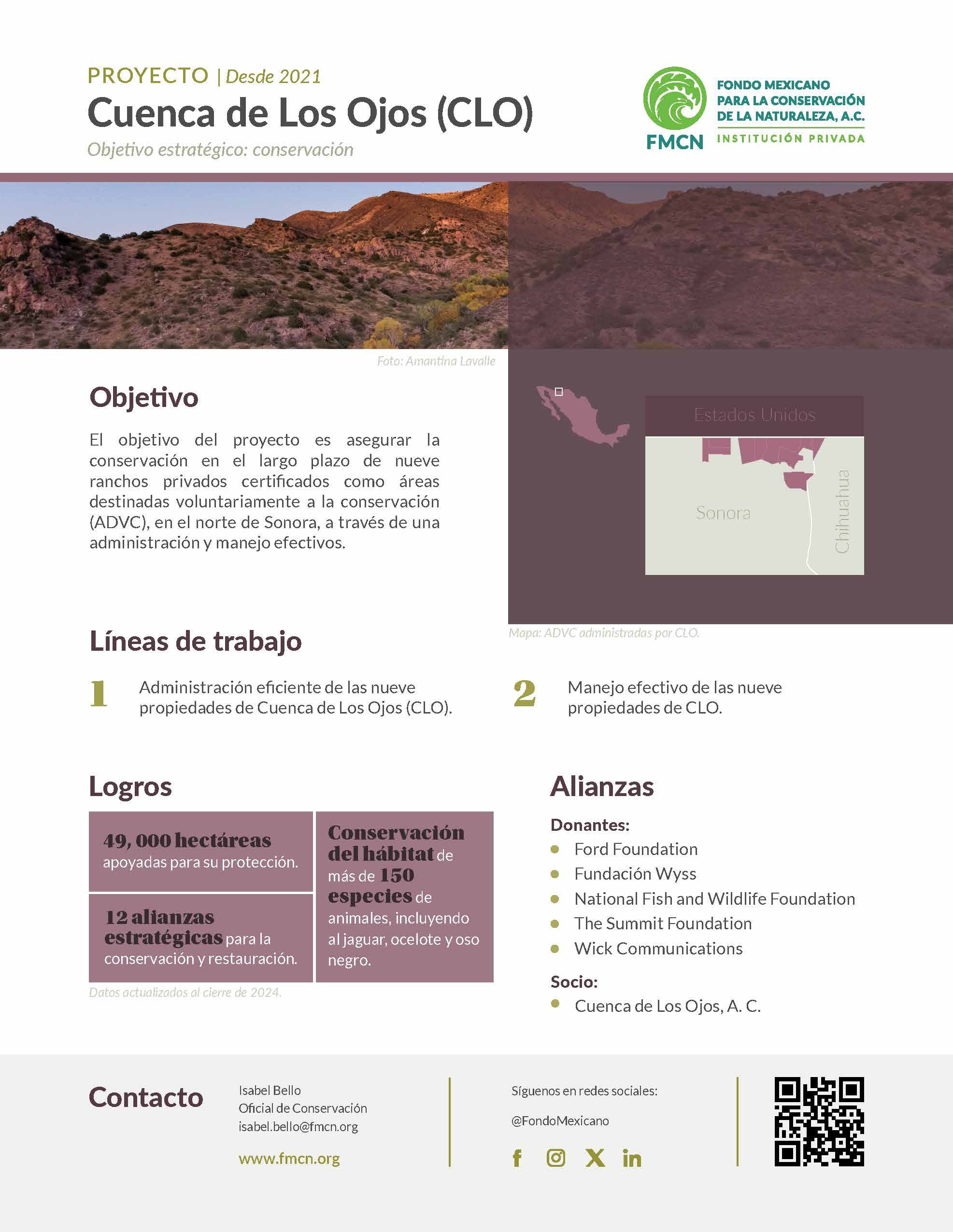 Cerca de 50,000 hectáreas bajo protección, CLO continúa trabajando en la conservación de pastizales y ecosistemas prioritarios, en coordinación con diversas organizaciones y universidades nacionales e internacionales. Entre la especies beneficiadas por estos esfuerzos se encuentran el oso negro (Ursus americanus), el jaguar (Panthera onca), el puma (Puma concolor), el ocelote (Leopardus pardalis), el castor americano (Castor canadiensis), el venado bura (Odocoileus hemionus), el bagre yaqui (Ictalurus pricei), el águila real (Aquila chrysaetos), entre otras especies de aves residentes y migratorias.