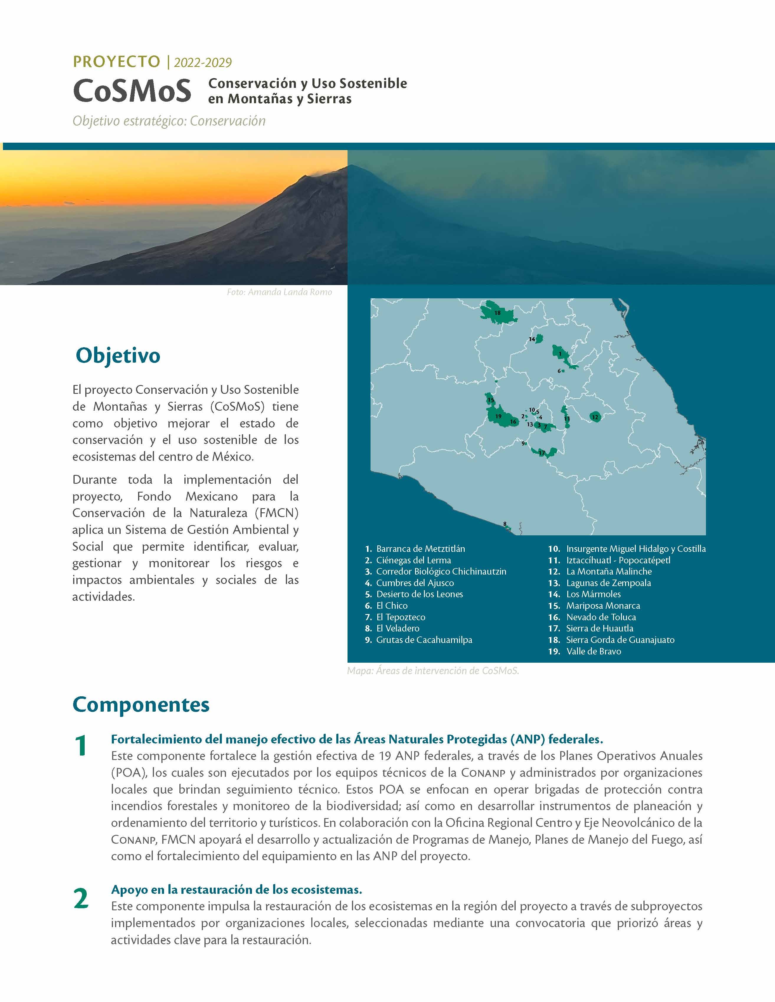 En CoSMoS está plasmada la visión actual del Gobierno de México de fortalecer el manejo sostenible del territorio, mejorar el manejo efectivo de sus áreas naturales protegidas (ANP) y áreas de influencia, y fortalecer a las comunidades que las habitan, enfrentándose a nuevos retos globales, como la reciente pandemia por COVID-19 y los efectos del cambio climático.