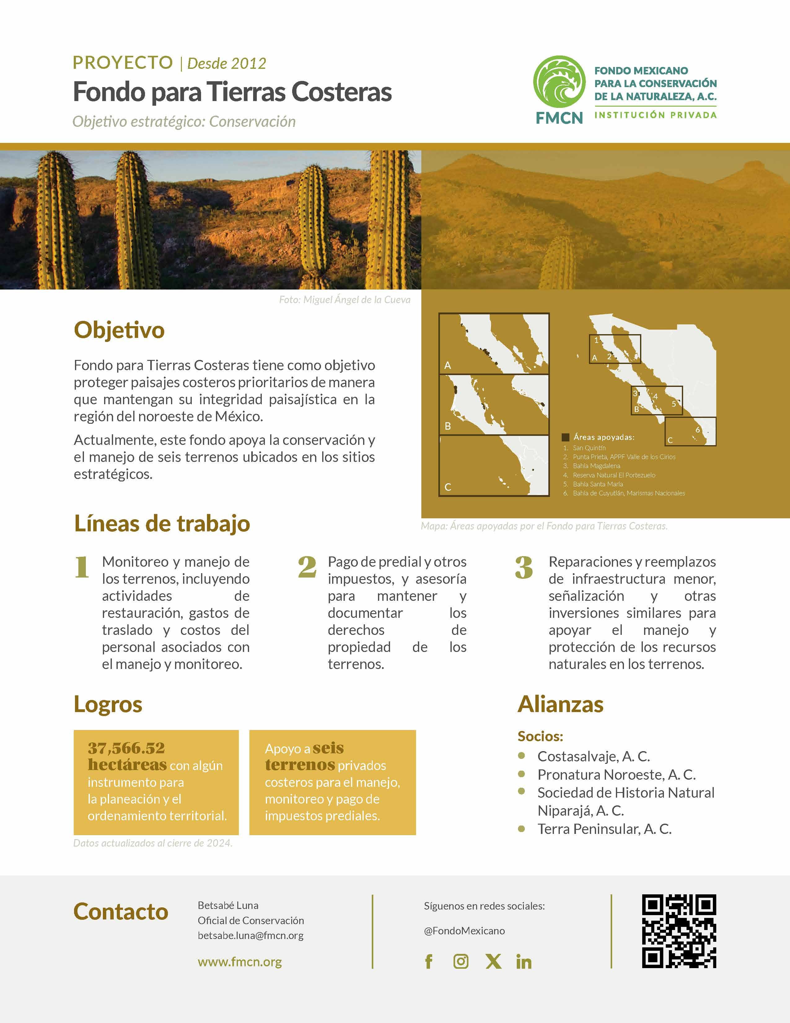 Desde 2013, el Fondo para Tierras Costeras ha financiado seis subproyectos liderados por cuatro organizaciones locales que poseen terrenos costeros designados como Áreas Destinadas Voluntariamente a la Conservación o unidades de manejo ambiental. Estos predios se ubican en sitios estratégicos de Baja California, Baja California Sur, Sinaloa y Nayarit, y su conservación contribuye a proteger más de 37,000 hectáreas de ecosistemas costeros.
