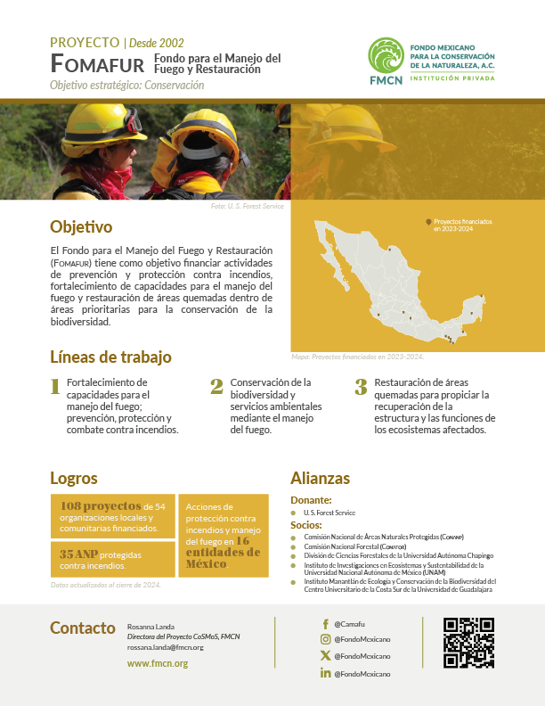 En 2002, mediante la asignación de un patrimonio, FMCN creó el Fomafur para dar permanencia a las actividades de manejo del fuego. Mediante convocatorias bianuales dirigidas a organizaciones y comunidades rurales e indígenas, Fomafur busca contribuir al fortalecimiento e implementación de las políticas públicas vigentes en el tema de conservación de la biodiversidad y los ecosistemas forestales de México (Ley General de Desarrollo Forestal Sustentable y Programa de Manejo del Fuego 2020-2024). Fomafur está alineado con las tendencias internacionales en los temas de protección contra incendios forestales y manejo del fuego (United Nations Environment Programme - 2022; Spreading like Wildfire – The Rising Threat of Extraordinary Landscape Fires; A UNEP Rapid Response Assessment; Nairobi).