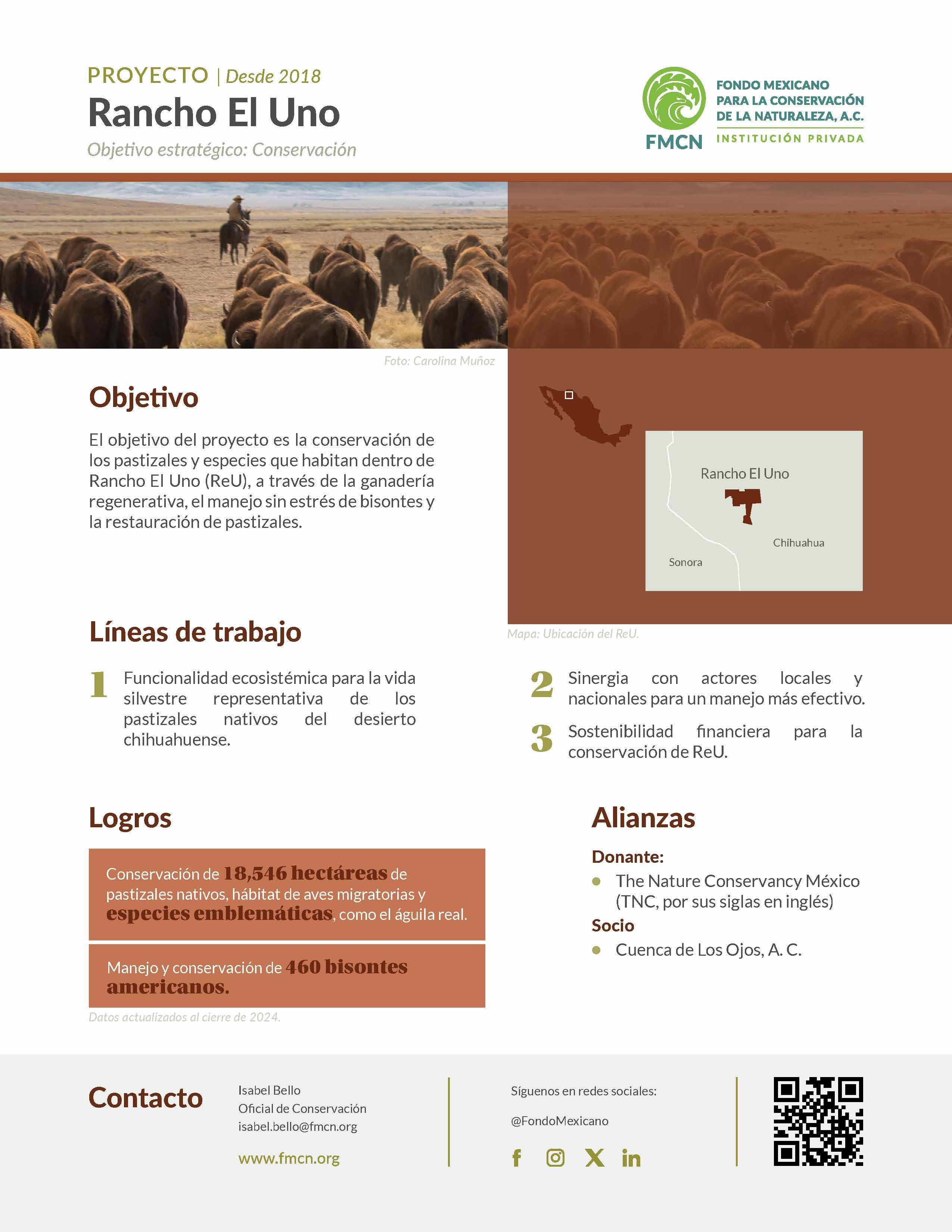Rancho El Uno (ReU) tiene como objetivo conservar los pastizales del desierto chihuahuense y las especies que los habitan, a través de la ganadería regenerativa, el manejo sin estrés de bisontes y la restauración de pastizales.
